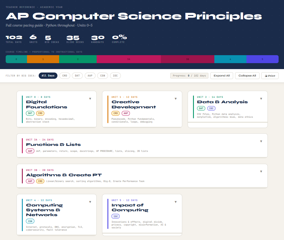 Stop building your AP CSP curriculum from scratch. This is a complete, classroom-tested Python-based AP Computer Science Principles course — 102 instructional days across 6 units, built around the College Board’s five Big Ideas.
