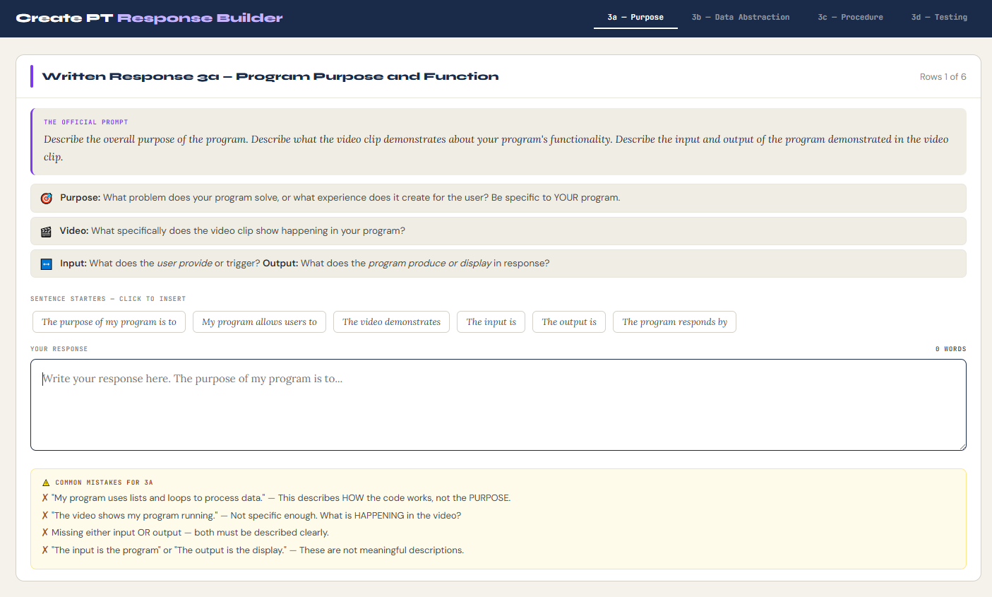 Written Response Builder Tabbed scaffold for prompts 3a, 3b, 3c, and 3d. Each tab shows the official prompt, what the rubric requires, clickable sentence starters that insert into the text area, and a live quality checker that analyzes the response as the student types — flagging if input, output, parameter description, step-by-step explanation, or testing calls are missing. Each tab also has a common mistakes warning panel.